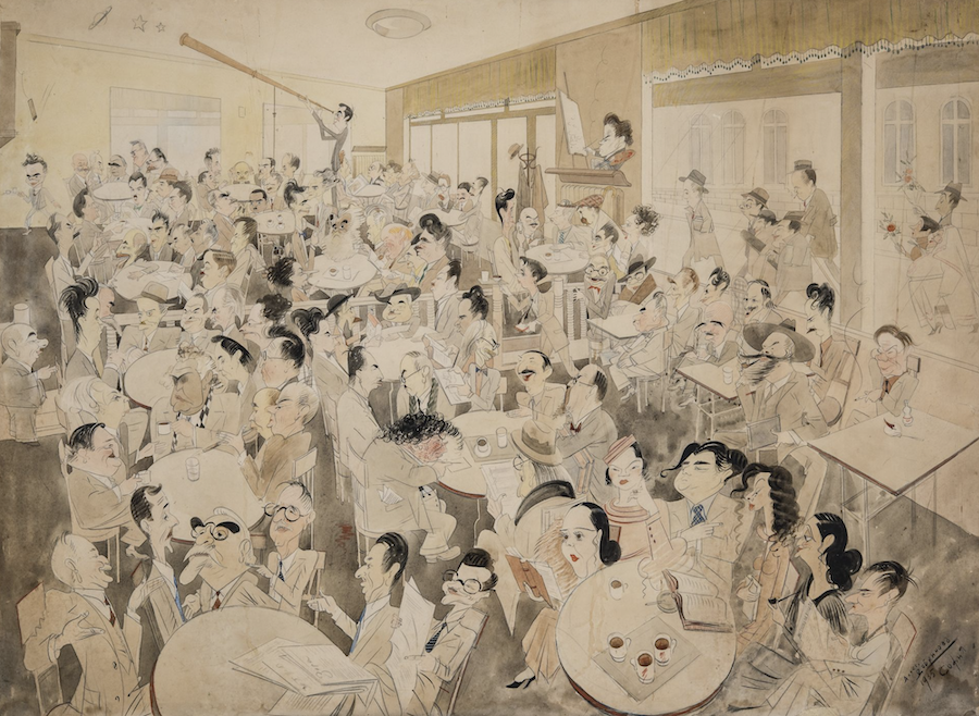 Картина: Александър Добринов, Шаржова рисунка от 1935 година на 106 видни български поети, писатели, критици, артисти, актьори, художници, архитекти, индустриалци, политици в тогавашното кафене " Цар Освободител "