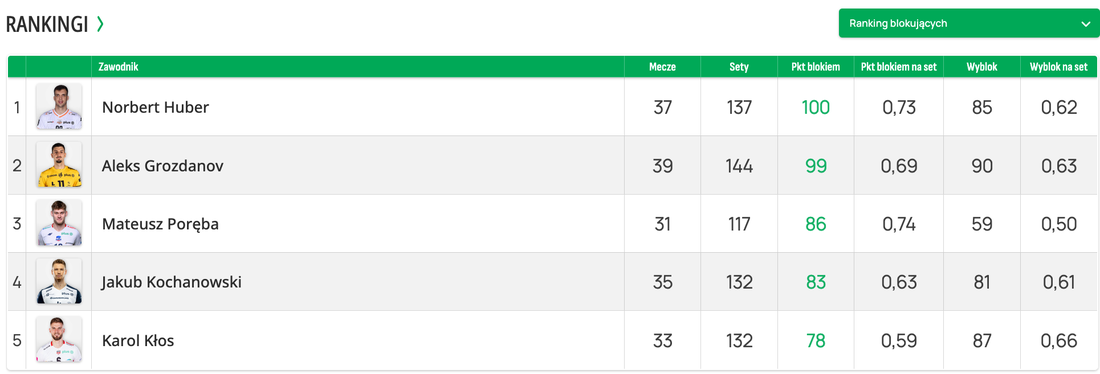 Алекс Грозданов завърши сезона със 144 изиграни гейма в 39 мача и 99 точки от обсада, което му отрежда второ място измежду блокировачите в формалната ранглиста на Plus Liga – директно зад Норберт Хубер, който има 100 блокади. Това значи приблизително 0.69 блокади на гейм.