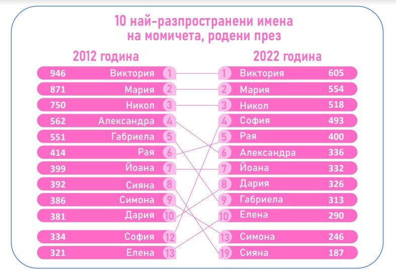 Българинът праволинейно държи на тези шест имена. Преди 10 години те също са били в Топ 3, надлежно за девойките и момчетата. През 2012-а подреждането при девойките е безусловно същото, а при момчетата тогава №1 е било името Георги (1 204), следвано от Александър (1 188) и Мартин (1 044).