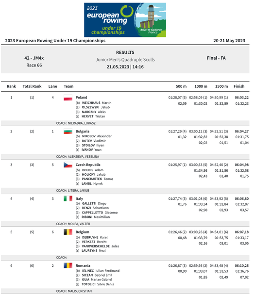 Мощен заключителен спринт на Александър Николов, Владимир Ботев, Илиян Стоилов и Йоан Иванов изведе българската четворка скул до второ място и сребърен орден, откакто изминаха дистанцията от 2000 метра за 6:04,27 минути.