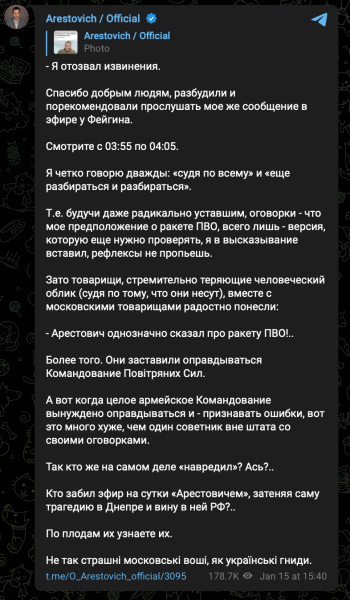 Блогърът също укори критиците си, че те „ бързо губят човешкия си образ “ и са го обвинили, че „ Арестович недвусмислено е споделил за ракетата за противовъздушна защита “. Освен това, съгласно съветника на канцеларията на президента, неговите съперници по този метод са принудили командването на Военновъздушни сили на въоръжените сили на Украйна да се извини.