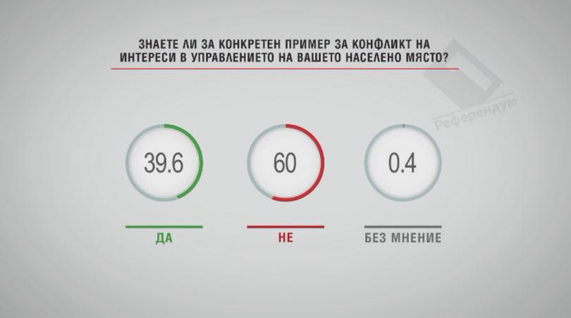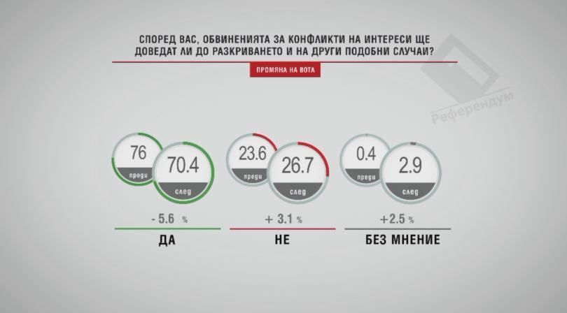 Преди полемиката в предаването " Референдум " 76% от допитаните са на мнение, че обвиняванията в спор на ползи ще доведат до разкриването и на други сходни случаи. В края на предаването над 3% са трансформирали настройките си и считат, че няма да доведат до други сходни случаи.