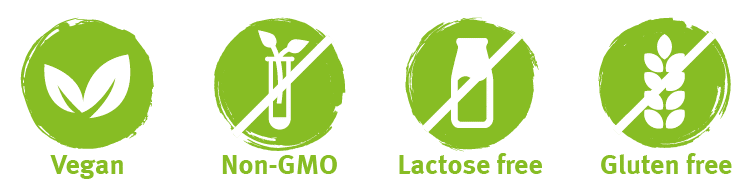 Глутен, млечни артикули, лактоза, соя, дрожди, яйца, захар, скорбяла, царевица, скотски вещества, уплътнители, изкуствени подсладители и оцветители, опаковани в растителни капсули (vegetarian capsules HPMC). Без ГМО!