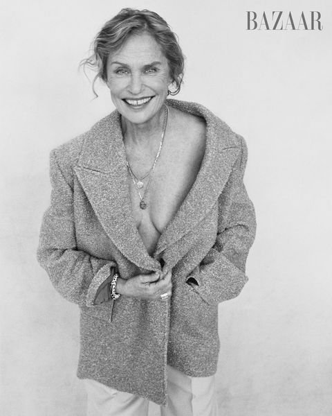 78-годишната моделка се появи топлес с бежово сако Gucci и карирани панталони от същата марка. На поставените фрагменти тя прикрива с ръце голите си гърди, като се усмихва на камерата. Като украшения бяха определени няколко златни огърлици от Tiffany & Co. Образът на звездата беше допълнен от гол грим.
