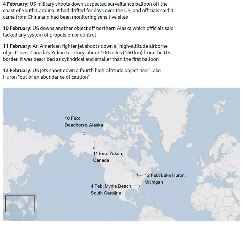 Предполагаем китайски шпионски балон беше свален край крайбрежията на Южна Каролина на 4 февруари, откакто в продължение на дни се носеше над Съединени американски щати. Длъжностни лица обявиха, че балонът е създаден от Китай и е бил употребен за наблюдаване на чувствителни обекти.