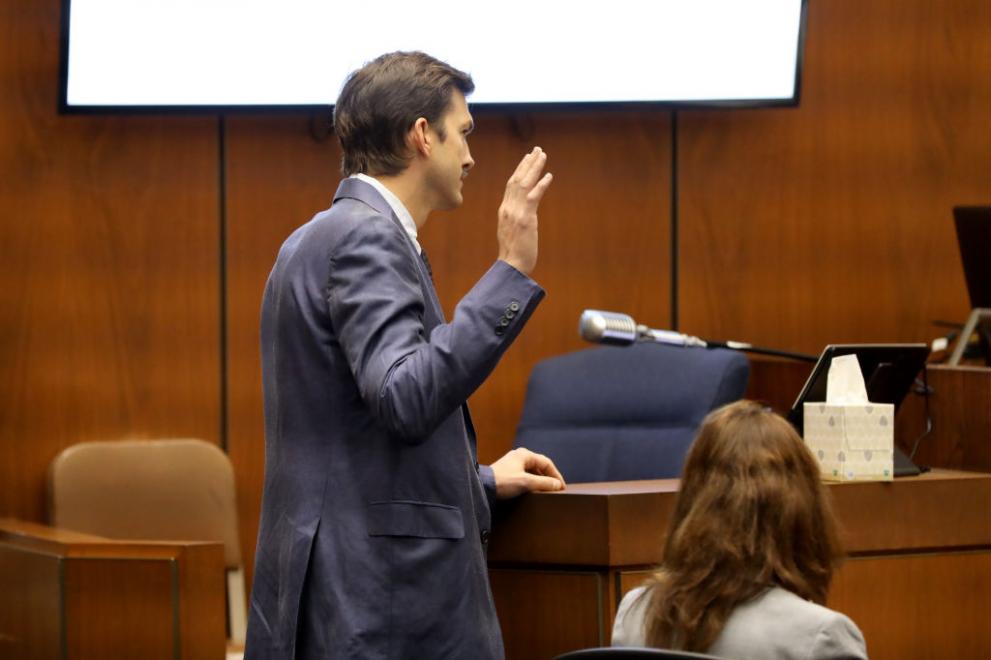 Ащън Къчър свидетелства в съда по дело за убийство