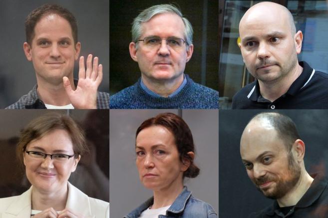 Журналистът от в. " Уолстрийт джърнъл " Еван Гершкович (горе вляво), някогашният морски пехотинец Пол Уилън (до него), някогашният началник на придвижването " Отворена Русия " Андрей Пивоваров (горе вдясно), съветският опозиционен деятел Владимир Кара-Мурза (долу вдясно), основаната в Прага редакторка в татарско-башкирската работа във финансираното от американското държавно управление Радио " Свободна Европа " Алсу Курмашева (долу в средата) и Лилия Чанишева , някогашна координаторка на районни офиси на починалия съветски опозиционер Алексей Навални.