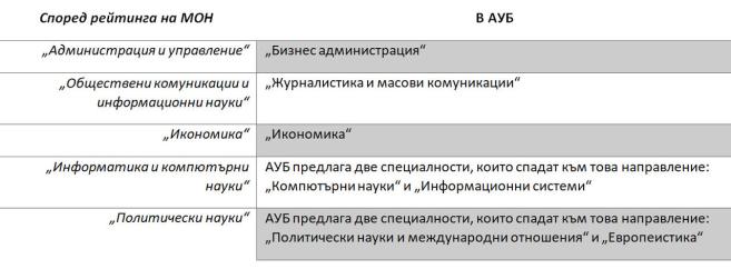 *В текста са представени професионалните посоки по метода, по който попадат в рейтинговата система на МОН. По-долу са изброени техните сходства в АУБ.