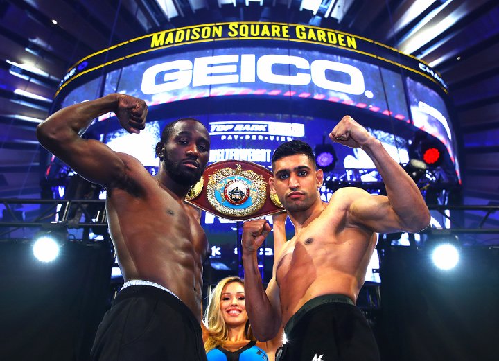 Terence Crawford (34-0, 25 KOs) will defend his WBO welterweight title against Amir " King " Khan (33-4, 20 KOs) Saturday night at Madison Square Garden on the inaugural Top Rank on ESPN PPV (9 p.m. EST/6 p.m. PST). - • Terence Crawford 146.4 lbs vs. Amir Khan 146.6 lbs (Crawford's WBO Welterweight world title - 12 Rounds) - - Chas Wright @medaforacle for @frontproofmedia - - #CrawfordKhan #boxing #boxeo #boxingheads #boxingfans #boxingday #boxingnews #boxinggym #boxinglife #boxingjunky #boxingworld #boxingguru #boxingtalk #boxingislife #boxingtraining #boxinghype #photooftheday #frontproof