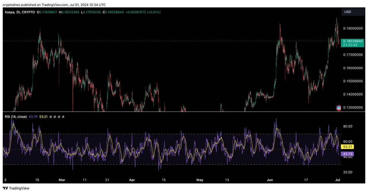 Към момента показателят на относителната мощ (RSI) на Kaspa е към 53 и има възходяща наклонност. RSI, импулсен осцилатор, мери изискванията на свръхпокупка и свръхпродажба на даден актив по канара от 0 до 100. Стойности над 70 допускат, че активът е свръхкупен и може да претърпи промяна, до момента в който стойности под 30 демонстрират, че е свръхпродаден и може да се възвърне.