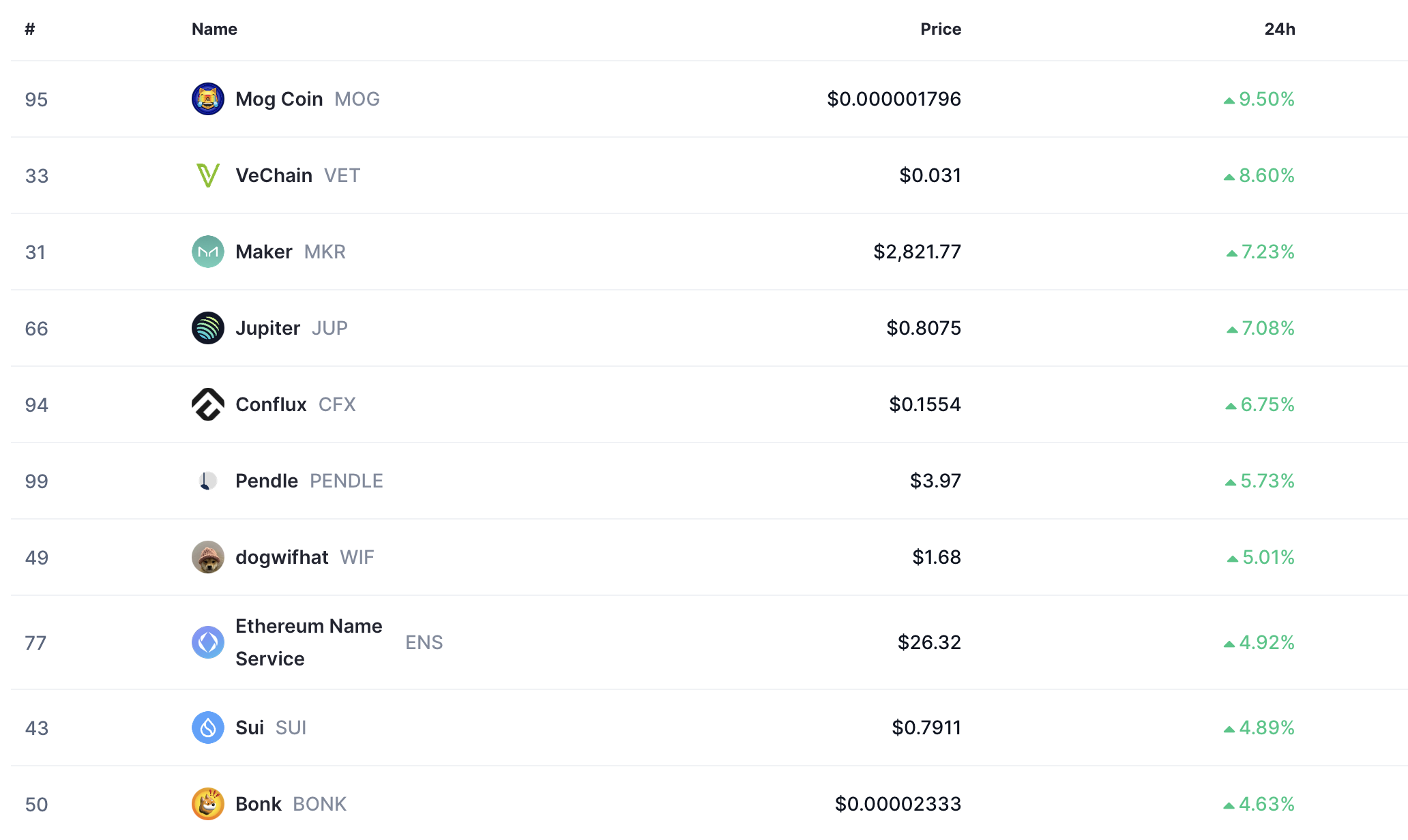 По данни на CoinMarketCap към 20:40 ч. (българско време) на 14 юли, най-добре представилите се монети през миналата седмица измежду първите 100 са: