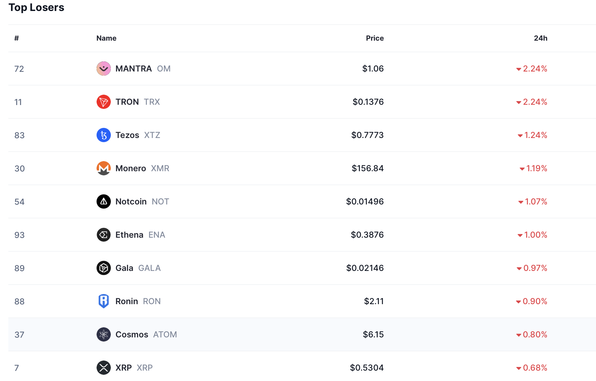 В идната таблица може да разгледате топ 10 най-губещите измежду 100-те най-големи криптовалути. Имайки поради, че най-големия спад измежду губещите криптовалути се равнява на 2.24%, а най малката-печалба от горната таблица е към 4.6%, може да се стигне до заключението, че седмицата е била по-скоро позитивна.