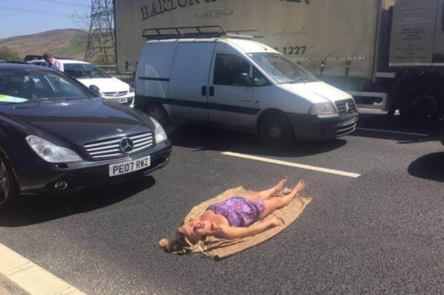 27-годишната фенка на слънчевите бани опънала едно одеялце на автомагистралата и се настанила на асфалта, с цел да събере малко загар. Действията ѝ провокирали цялостен възторг, само че другояче изнервените водачи откровено се забавлявали с нея.