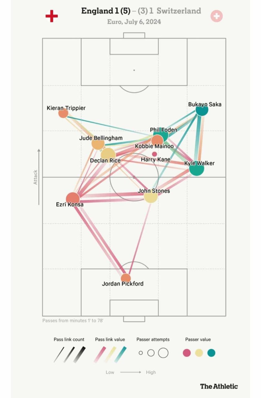 Няма нищо неприятно да „ теглиш “ някого от бранителите на съперника със себе си, само че когато връзката със съотборниците ти страда, е противоречиво тогава и какъв е коефициентът на потребно деяние. Изданието Athletic отлично илюстрира това посредством графика, показваща връзките сред обособените футболисти на Англия при офанзивите, цената на подаванията им, честотата на подаванията, посоката на подаванията. Хари Кейн не изпъква при нито един от съставените елементи. Чисто статистически – 14% от докосванията на Кейн до топката идват по фланговете … в половината на Англия обаче. Други 10% - тъкмо в центъра на терена.