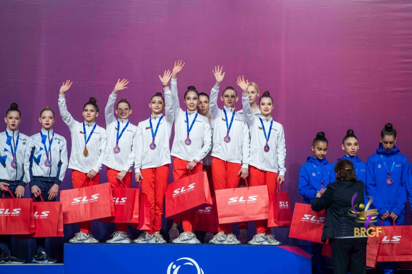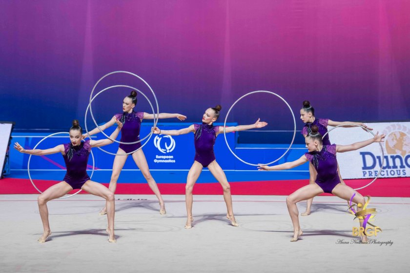 Рая Божилова Йоана Мотева, Анания Димитрова, Габриела Трайкова, Ивайла Велковска и Елена Христова стигнаха до златото със общ брой от 50.700 точки, откакто за осъществяването си с пет обръча получиха 25.950 точки (трудност 10.900, осъществяване 7.200 и артистичност 7.850), а за това с пет чифта бухалки бяха оценени с 24.750 точки (трудност 9.700, осъществяване 7.300 и артистичност 7.750).