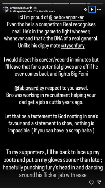„ На моите почитатели: ще се върна да вържа обувките и да сложа ръкавиците напълно скоро – уповавам се да разбия главата на Фюри и с лекост да танцувам към неговия нерешителен ляв прав. “