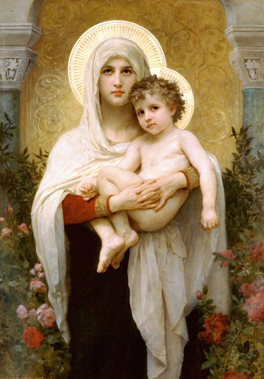 В Енциклопедия на знаците написа: „ Християнската иконография трансформира розата в „ Царица на цветята ”, тъй като тя символизира непорочността на Мария, небесната майка. Вследствие на това през Средновековието единствено девствениците можели да носят венци от рози, а Мадоната била изобразявана измежду гора от рози.