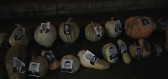 Тикви със фотоси на депутати са подредени на стълбите пред Народното събрание.