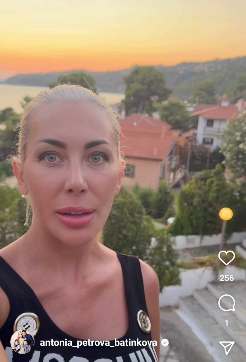 Огромна глава, изцъклен взор, изгоряла алена кожа и бръчки под очите – това виждаме на сподлените й фрагменти. Юристката очевидно не знае какъв брой е значима слънцезащитата и не се маже с такива артикули, съдейки по аленото й лице и деколте. Мис Крокодил, както я кръсти Евгени Минчев, почива цяло лято в Гърция, тъй като е изморена от напрегнатото си всекидневие в София. Дните и минават на маса с мъжа й, както и под жаркото слънце на плажа, а със синовете им Благовест и Ивайло се занимават двете им бавачки.