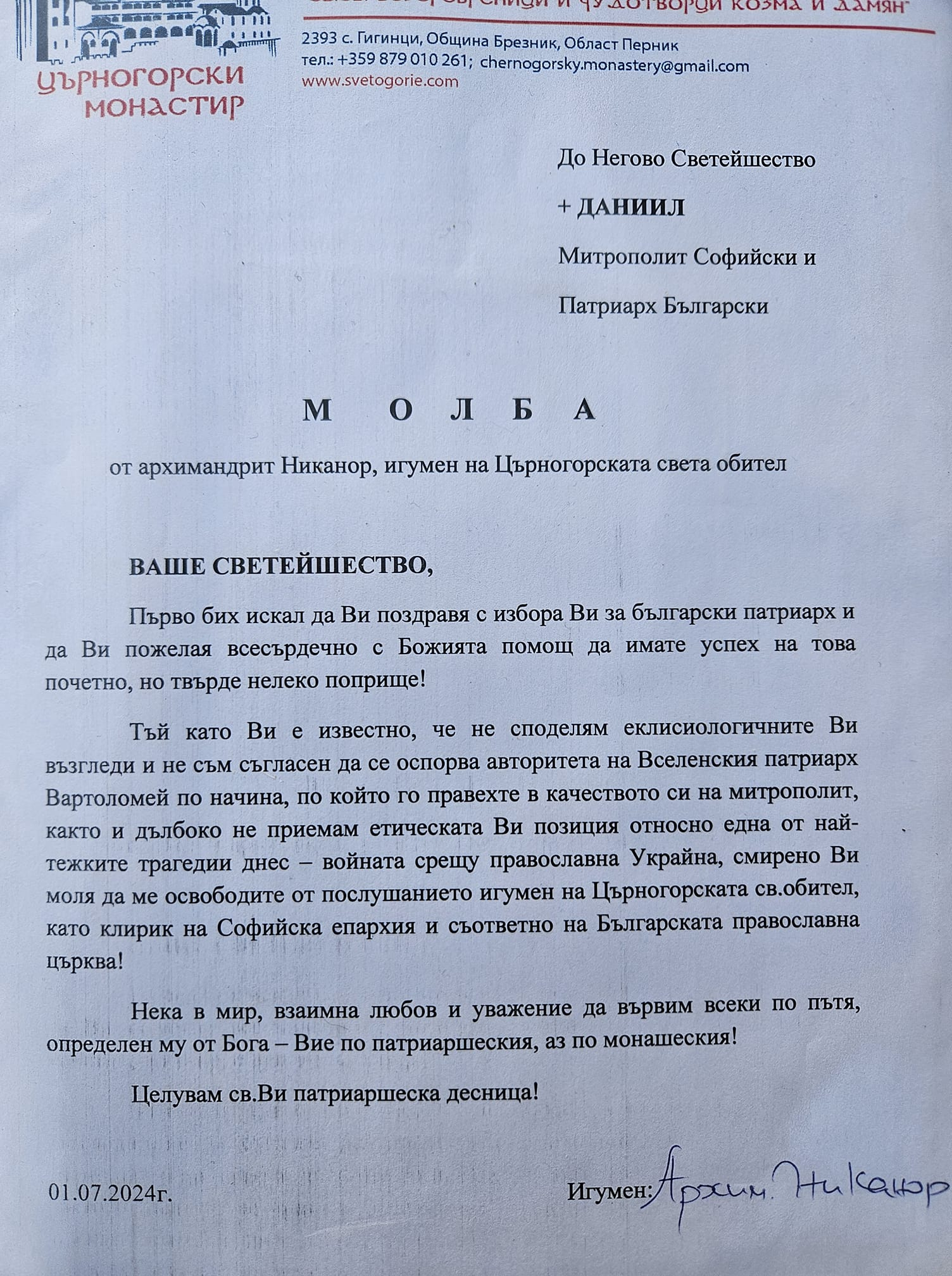 Архимандрит Никанор към този момент е изпратил молба до патриарх Даниил, с цел да бъде освободен като свещеник на Гигинския Църногорски манастир.