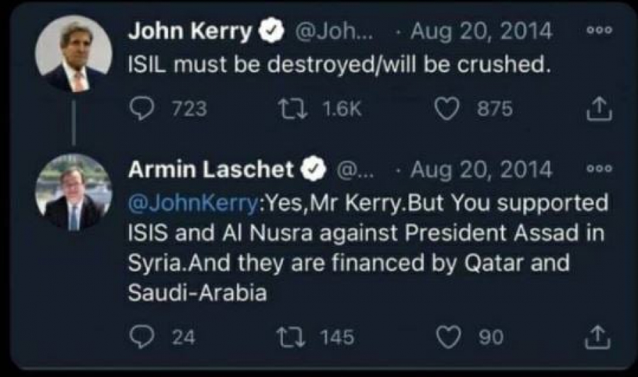 Упс, погледнете му туит от 2014, в който той упреква Джон Кери, че Съединени американски щати поддържат ИДИЛ и Ал-Нусра против Асад и Сирия, напомня анализаторът.