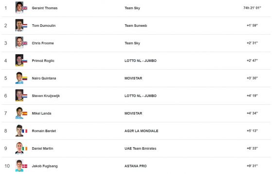Първи в общото нареждане за " жълтата фланелка " е британецът Гераинт Томас (Sky), който води с 1:59 минути пред втория Том Дюмулен (Холандия) и с 2:31 минути пред четирикратния победител Крис Фрум, който е трети.