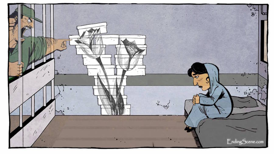 Творбата, която я вкарва в пандиза, е знак на митинг против проектите на иранското държавно управление за ограничение на достъпа на дамите до противозачатъчни средства и опита да се сложи отвън закона доброволната дезинфекция. Рисунката изобразява иранските държавни чиновници като кози и маймуни.