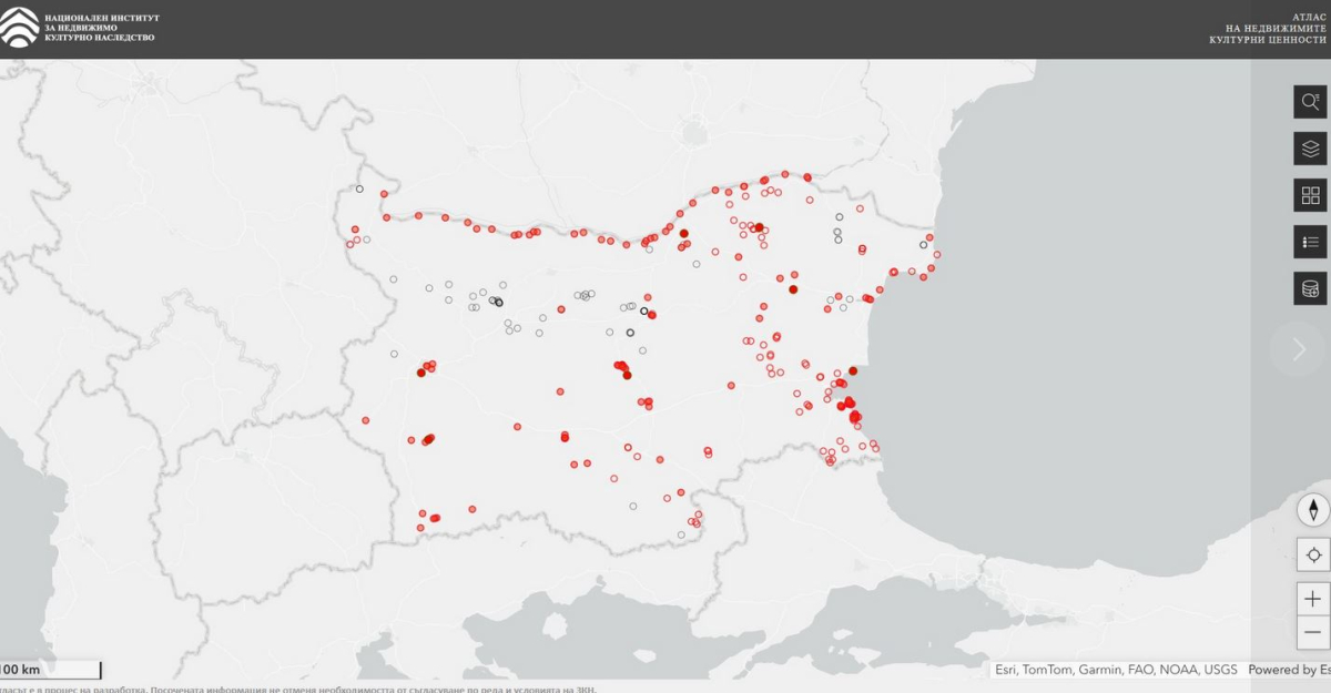 В базата данни са въведени и част от останалите обекти, само че единствено с техните координати и информация за статуса им. С червен силует са точките, в които се намират обекти от недвижимото културно завещание. Пещерите имат характерен статут и са маркирани със сив силует, оповестяват от институцията.