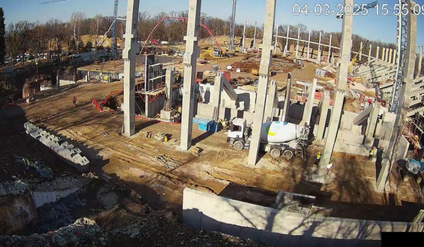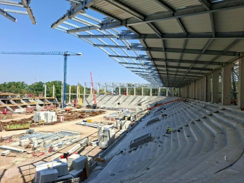 Преди известно време ремонтната бригада стартира работа по идващите пластове на козирката, която към този момент гордо стартира да се издига над трибуните.