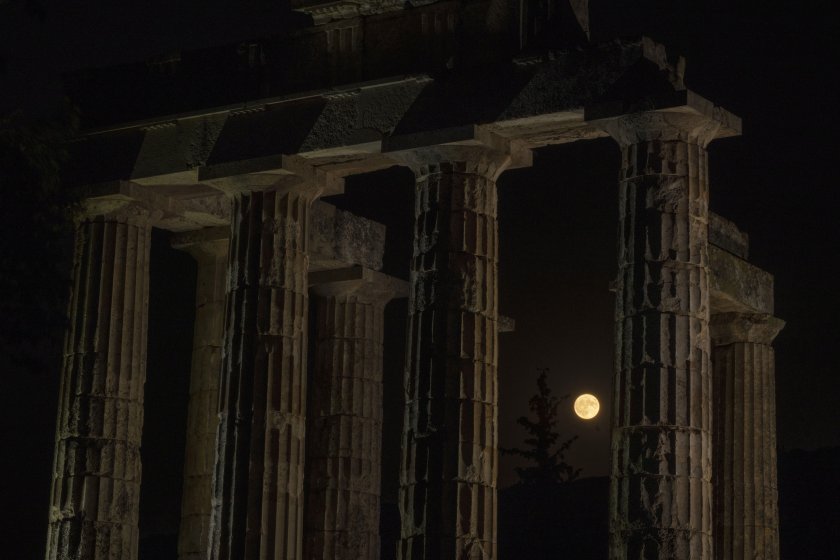 Августовската суперлуна огря тази нощ Храмът на Посейдон в Гърция.