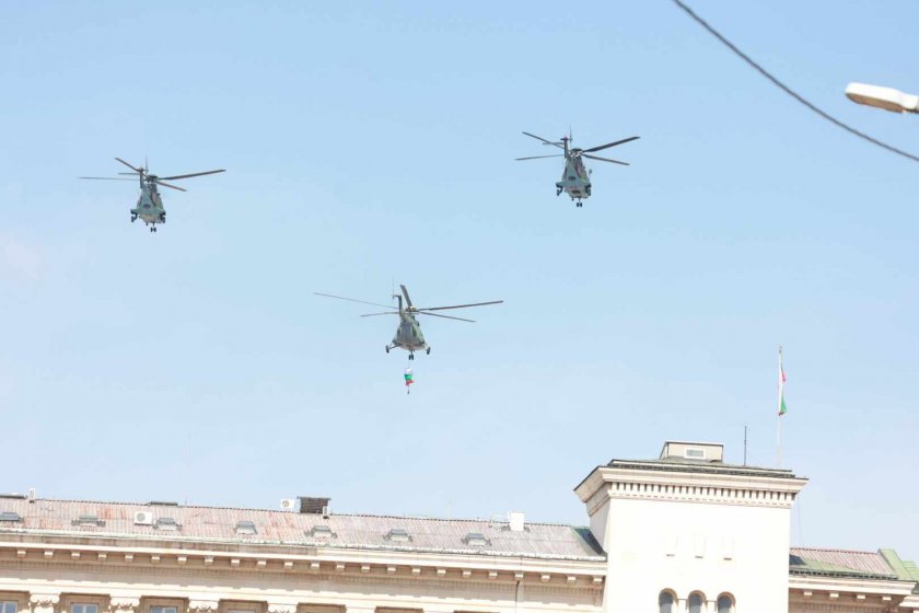 Авиобаза „ Враждебна “ е мястото, от което излетяха трите хеликоптера към центъра на София. Вертолетът Ми-17 лети във групировка чеп дружно два от вида „ Кугър “. Националният ни байрак прелетя в небето над столицата.