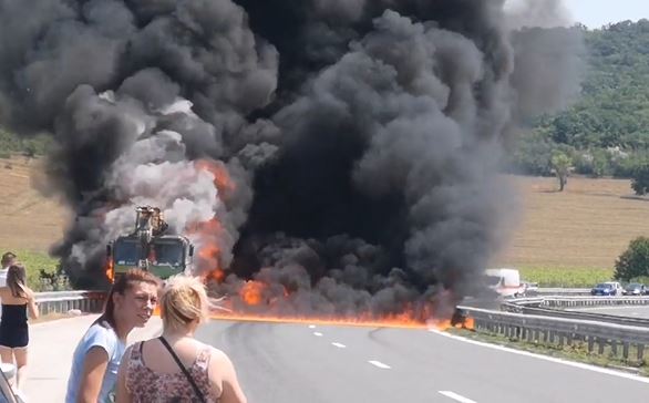 Автокран избухна в пламъци на Хемус, затвориха магистралата*
