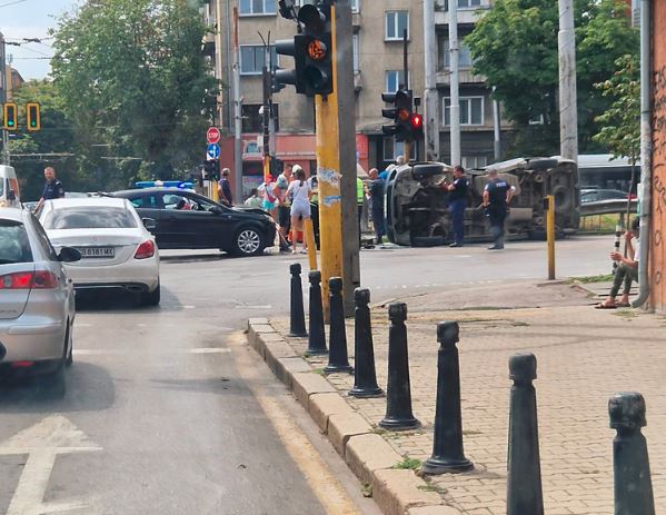 Кола се обърна след катастрофа на кръстовище в София СНИМКИ
