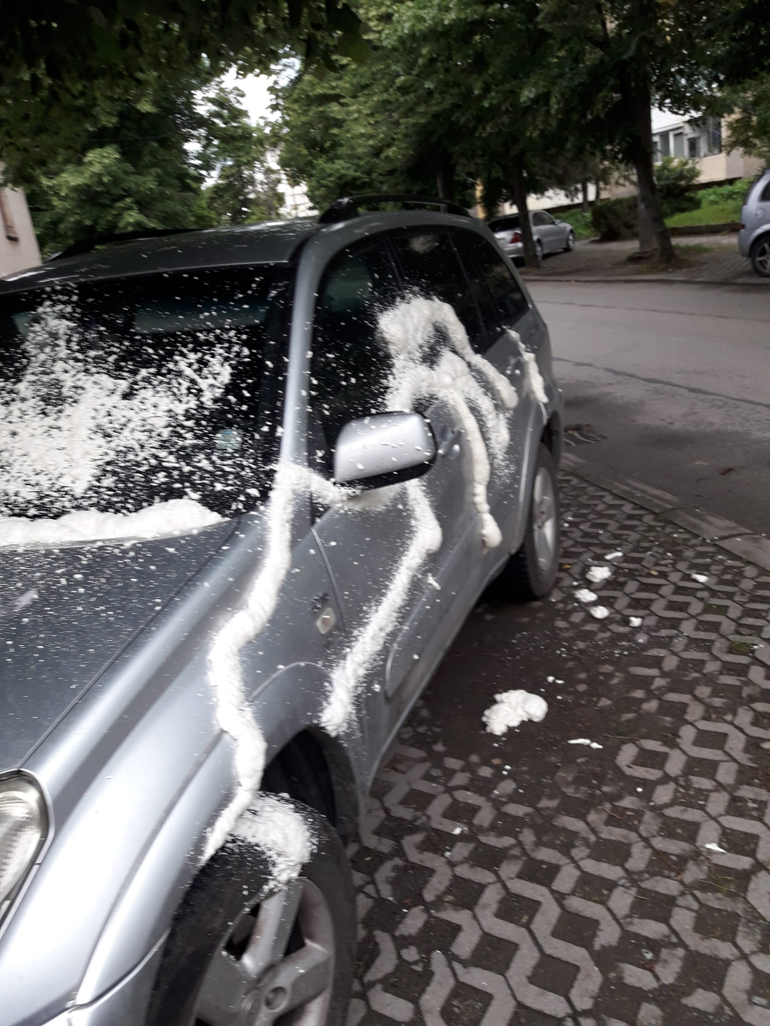 Мъжът е споделил фотоси, на които виждаме, че вратите на возилото са запечатани със строителна пяна, тъй че да не може да се отворят. Пяна има даже по предното стъкло на автомобила.