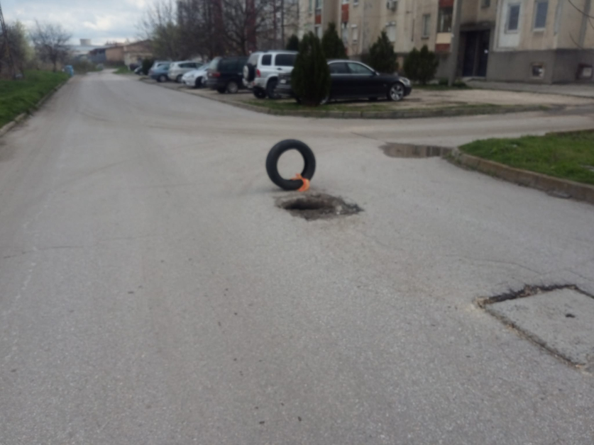 Автомобилна гума алармира за дълбока дупка на улица в Дмимитровград. Капак на шахта липсва и основава действителна заплаха за водачите на пътя. Мястото е ул. „ Простор “, до блок 15.