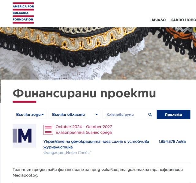 Подсигуряващо финансиране са получили и медиите, които разчитат на грантове от “Америка за България ”. " Медиапул " е получил 3-годишен грант на стойност 2 милиона лв.. В уеб сайтът работят 13 души, което значи, че грантът е еднакъв на 4237 лв. на месец на публицист в уеб страницата. Впечатление прави, че повода за гранта е “дигитална промяна ”, само че без пояснение по какъв начин един уеб страница, цифрова единица, претърпява цифрова промяна.