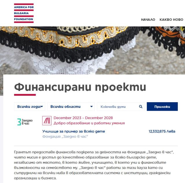 Фондация “Заедно в час ” също е получила великански грант на стойност 12 милиона лв. за интервала 2023-2028 година. Тази фондация още веднъж раздава финансиране за други НПО-та и персони, които организират образования измежду учители и деца за прогресивни полезности и “етническа приемливост ”.