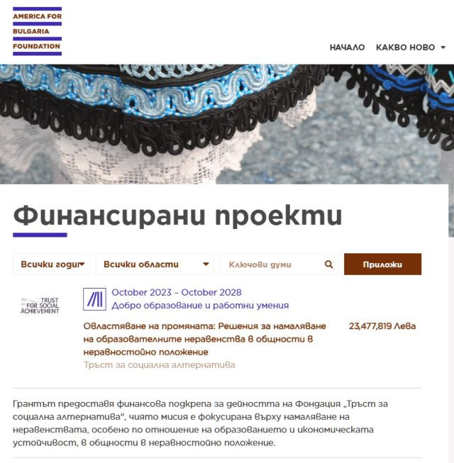 Фондация “Америка за България ” е раздала нови грантове за големи суми със период до 2028 година, когато завършва мандата на Доналд Тръмп в Съединени американски щати. Организацията е одобрила заплащане от 23 милиона лв. за “Тръста за обществена опция ” и 12 милиона лв. за фондация “Заедно в час ”. Двете НПО-та от своя страна раздават грантове на по-малките играчи в Неправителствени организации мрежите.