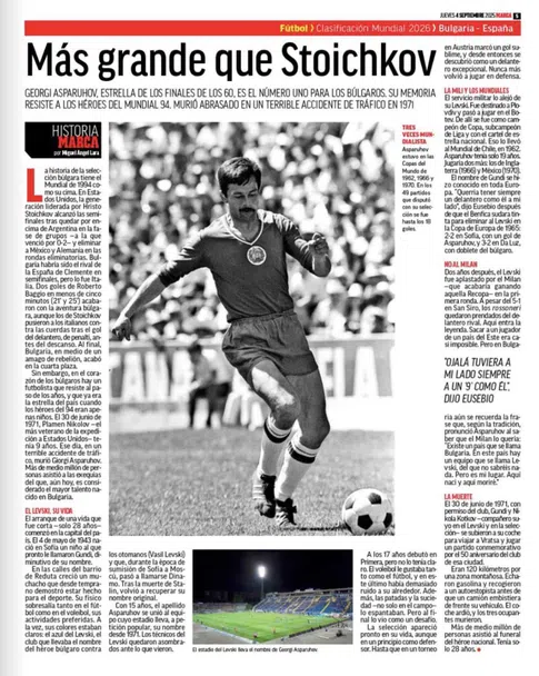 „ Marca “ показва, че въпреки поколението на Христо Стоичков да доближава връх в историята на националния отбор със сензационното четвърто място на Световното състезание в Съединени американски щати през 1994 година, за българите най-големият остава Георги Аспарухов. Изданието припомня, че когато България отстрани Аржентина, Мексико и Германия и доближава полуфиналите против Италия, Аспарухов към този момент повече от 20 години не е сред живите, само че споменът за него е по-силен даже от подвизите на „ златното потомство “.