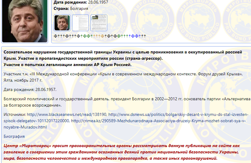 Президентът Георги Първанов (2001-2011 г.) също попада в уеб страницата за " умишлено нарушение на държавните граници на Украйна за влизане в окупираните територии в Крим за присъединяване в пропагандно мероприятие на Русия - страната агресор ". Участвал е в конференция " Крим в актуалния интернационален подтекст " през 2017 година