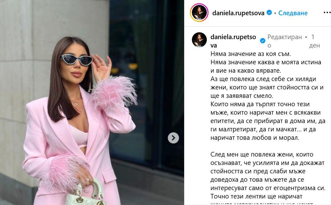 Тази „ бунтовна “ поръчка направи в обществените мрежи победителката в „ Ергенът “ Даниела Рупецова . Пишман писателката явно се пробва да се изживява като модерната Жана д`Арк, само че уви – звучи повече като Наталия Кобилкина от Тему.
