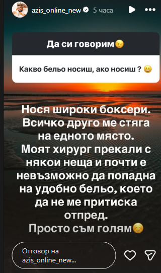 „ Имам пластична интервенция на пениса. Всеки мъж има един ресурс, когато натиснеш леко коремчето долу, над пениса, и той изскача повече. Става малко по-голям. Моят лекар оптимално натисна. Имало е случаи по света, в които излизат 5 сантиметра. При мен не излезе. Това място се облича в специфична течност, оформя се един нов пенис – като дебелина и дължина, и това е. С няколко сантиметра ”, обясни преди време Азис.