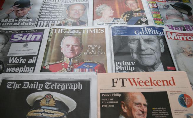 Таблоидите "Дейли мирър " и "Дейли мейл ", които нормално показват диаметрално разнообразни политически позиции, излязоха с съвсем идентични челни страници - фотография на кралицата и брачна половинка й, съпроводена с текст "Сбогом обичани мой " ( "Мирър ") и "Довиждане, обичани мой " ( "Мейл ").