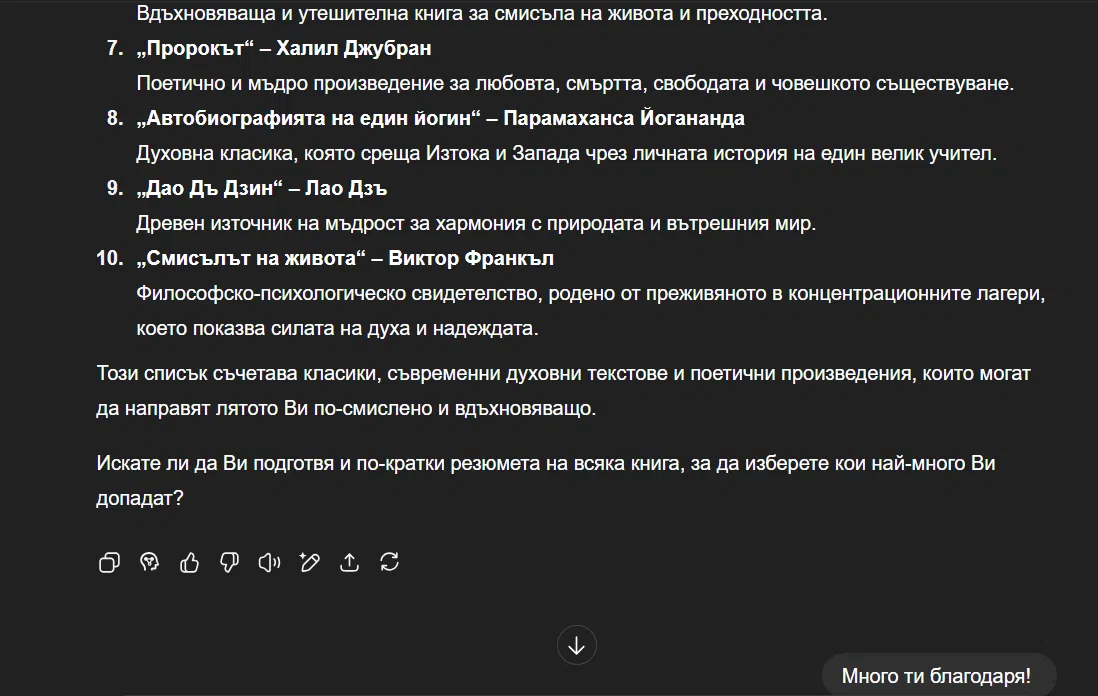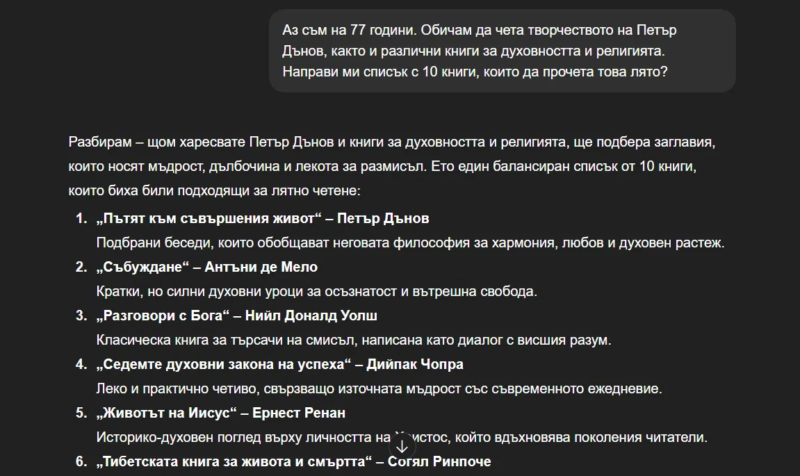„ Аз съм на 77 години. Обичам да чета творчеството на Петър Дънов, както и разнообразни книги за духовността и религията. Направи ми лист с 10 книги, които да прочета това лято? “ – грижливо написа баба ми в чата си с ChatGPT.