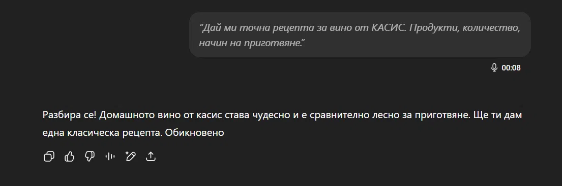 Когато попитах баба и дядо защо най-често се обръщат към чатбота, отговорът беше елементарен: за предписания. От вино от касис до съвършената лютеница, руло „ Стефани “ или агнешки котлети – очевидно и обичаните вкусотии на баба ми към този момент се зареждат от изкуствен интелект.