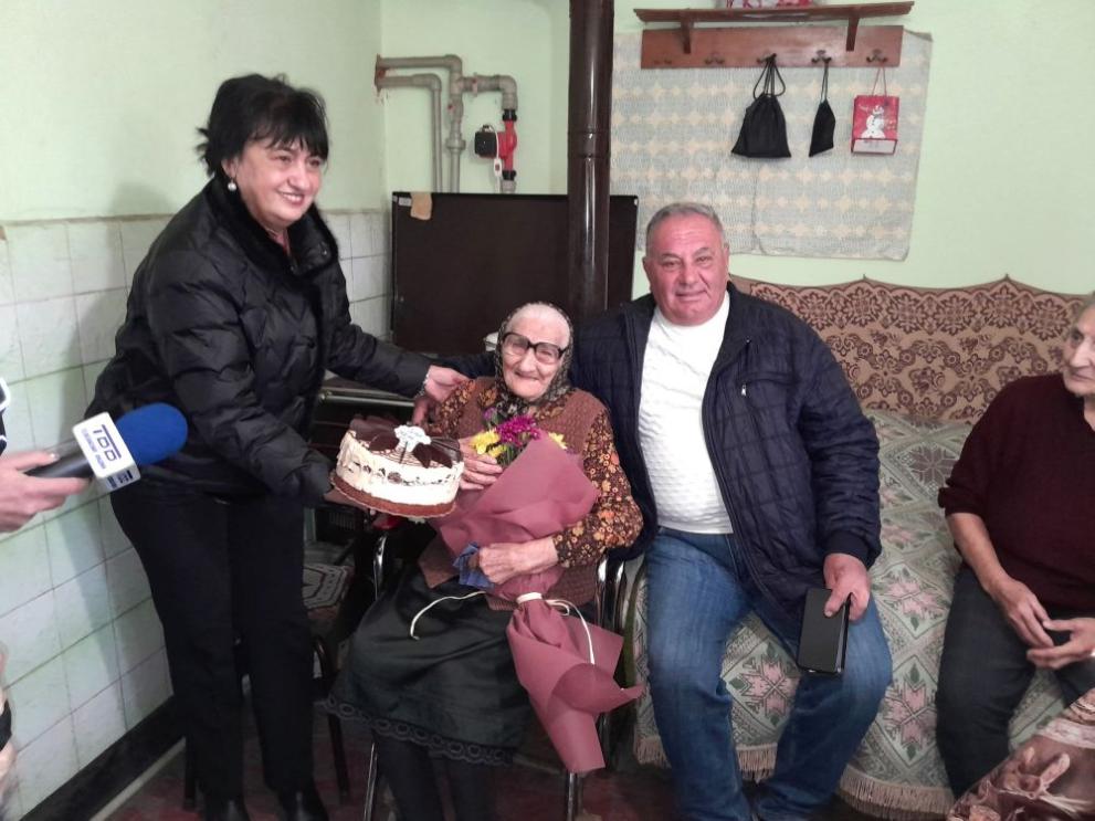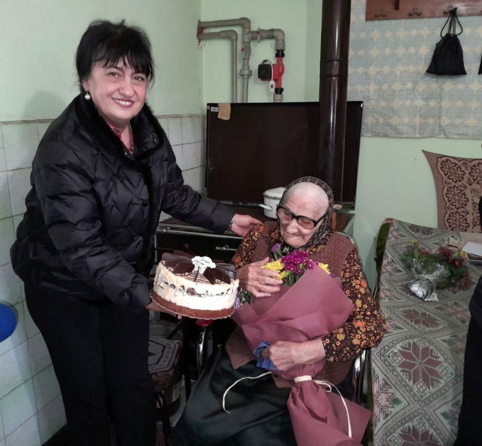 Тя й връчи грамота и приветствен адрес от името на кмета на Общината доктор Цветан Ценков. Борислава Борисова зарадва старата жена, като й сервира хубав букет цветя, торта и парична сума.