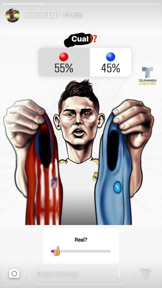 Затова в обществените мрежи се завъртя фотография по какъв начин неговият чичо Марио Рубио пита своите почитатели в Инстаграм къде би трябвало да заиграе колумбиецът. На нея е изобразен играчът, който в едната си ръка държи червено-бялата фланелка на Атлетико, а в другата - небесносиния екип на Наполи. Отгоре пък стои въпросът “Коя?” с двете варианти за отговор. Все отново, изпод има и вид, при който може да се избере и сегашния му тим.