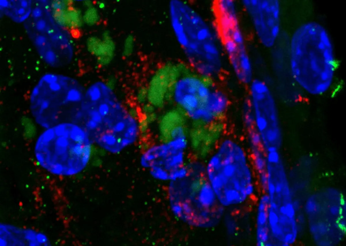 Griffith University Бактерията Chlamydia pneumoniae (зеленото) в мозъка на мишка, заобиколена от бета амилоиден пептид – идентифициращият белег на заболяването на Алцхаймер (червеното). Връзката сред бактерията и заболяването на Алцхаймер е известна отдавна, само че въпросът е по какъв начин тя попада в мозъка.