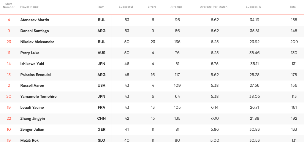 Атанасов си разделя първото място с аржентинското либеро Сантиаго Данини, който също има 53 чудесно посрещнати топки от 148 ориентирани към него.