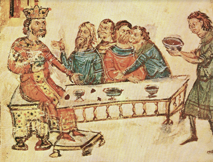 Хан Крум пирува след успеха над император Никифор. Миниатюра от българския превод на Манасиевата летопис. XIV век. Библиотека на Ватикана (л. 145). (История на България. Том 2. Първа българска страна. изд. на Българска академия на науките, София,1981.)
